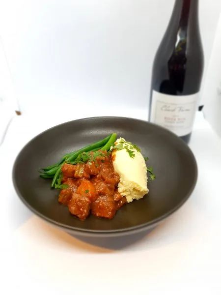 慢炖羊肉砂锅配青豆和土豆泥