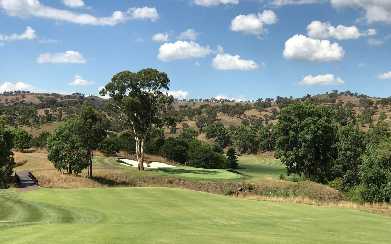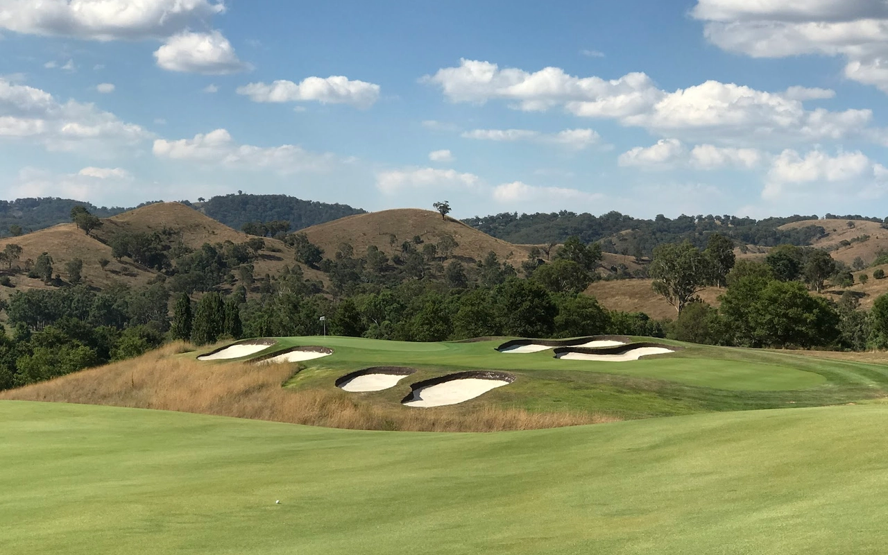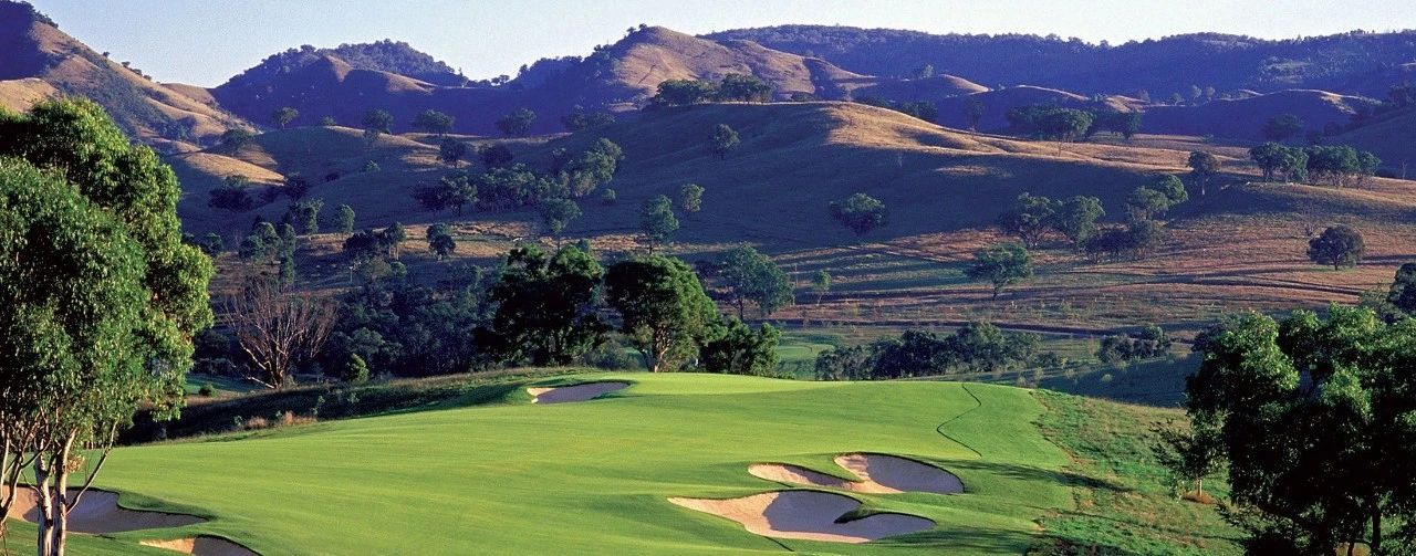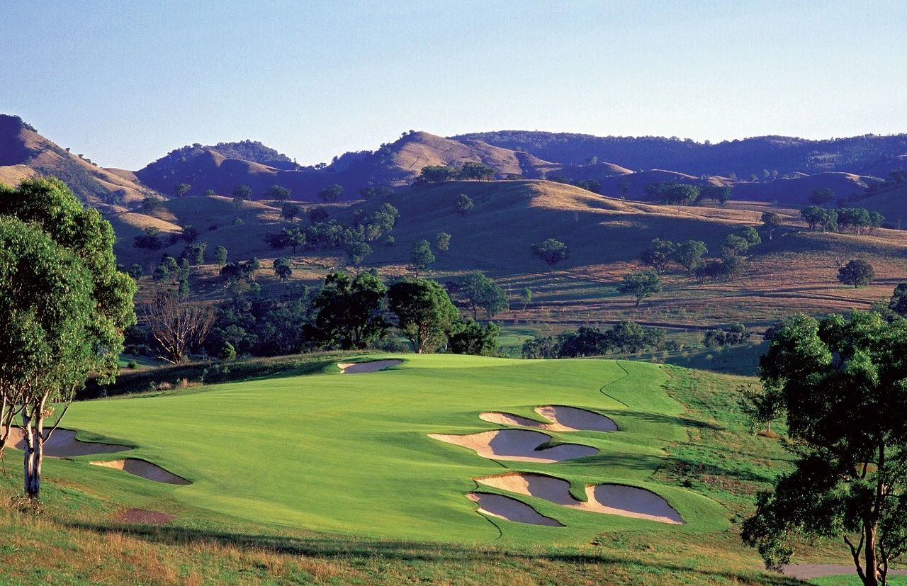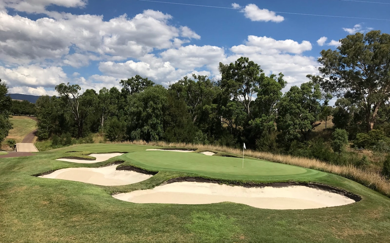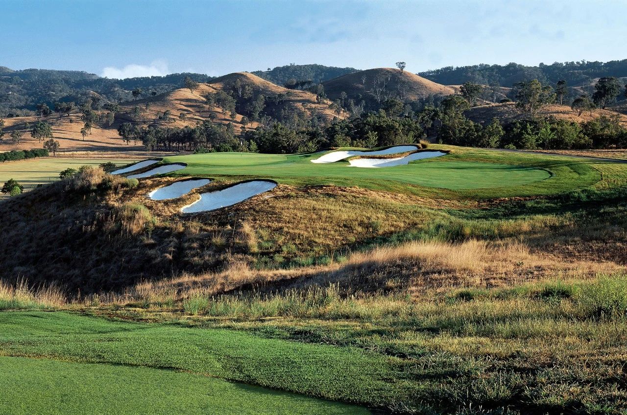 艾勒斯顿 (Ellerston) 坐落于新南威尔士州上猎人谷 (Upper Hunter Valley) 僻静的高地,是著名商人 Kerry Packer 庄园内的一座极其私密的 18 洞高尔夫球场。埃勒斯顿一直被评为世界上最好的高尔夫球场之一。美丽的埃勒斯顿庄园坐落在新南威尔士州上猎人谷僻静的高地,是名副其实的香格里拉,专供澳大利亚最富有的家庭之一独享。对于马术爱好者来说,这座庄园长期以来一直是一个地标,因为在其天然山谷和起伏的山丘中,有原始的马球场,被公认为世界上最好的马球场之一。1999 年,已故的克里·帕克 (Kerry Packer) 向格雷格·诺曼 (Greg Norman) 求婚,并指示他的公司为他建造澳大利亚最坚固、最壮观的内陆高尔夫球场,因此决定在该地产上增加高尔夫球场。由于预算不太可能成为问题,设计师诺曼·哈里森和鲍勃·哈里森面临的关键问题就变成了选择最佳地点。该团队获得全权使用帕克占地 70,000 英亩保护区的任何部分进行比赛。经过几天的搜寻,人们发现了湍急的佩吉斯溪,并立即认为这是建造帕克先生想要的戏剧性球场的完美地点。这条小溪是该布局的中心特征,并包含不少于九个球洞,其余的大部分球洞建在远离障碍区的地势较高的地区。由于对难度级别的狂热,客户决心为世界上最好的玩家提供终极挑战,这使得设计师比平时承担了更多的风险。其中一个场地,即第六球场,实际上在球场开放后不久就被大雨冲毁了。考虑到该地区容易发生洪水,这并非完全出乎意料,因此,为了减轻不断重建果岭的担忧和费用,建议采用抬高的替代方案。然而,帕克毫不犹豫地下令在原地重建果岭,并指示他的设计团队在每次果岭被冲走时都这样做。除了体验其独特性之外,艾勒斯顿的亮点还在于要求较高的长洞,这是一场无情的驾驶考验。每个球都需要在球道的优质部分放置一个长炸弹,以确保线路畅通无阻地进入果岭。其中八个四杆洞的长度在 430 至 460 码之间,但由于使用对比障碍和不断的海拔变化,它们作为一个整体非常多样化。7号洞和 8 号洞是精彩的例证,下坡的 7 号洞比 8号洞长 50 码,但通常打得更短。发球台建在山坡上,令人生畏,开球沿着小溪向 200 码外的球道打。果岭环境的多样性,无论是戏剧性地推向障碍区,还是设置在天然沟壑或小山脊上,都非常引人注目。大多数目标都由令人印象深刻的诺曼/哈里森掩体形状构成,尽管像第 5号、第 10号和第 16号这样的无掩体目标也很有吸引力。翦草推杆面专为高速而设计,面积巨大且毫无瑕疵。同样,球道的呈现通常是无可挑剔的。水牛短草为纯粹的沙发打球走廊提供了鲜明的颜色和纹理。