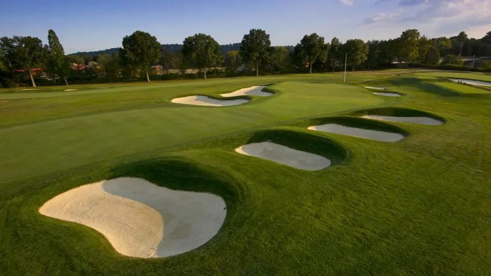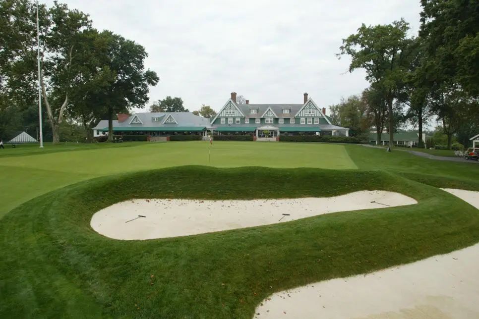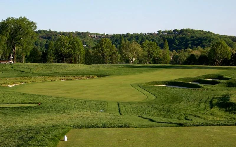 上世纪 90 年代初至 2015 年间,数万棵树(大部分种植于 2015 年代)被砍伐后,奥克蒙特最初的惩罚设计被重新建立,其中包括了比赛中最肮脏、最臭名昭著的沙坑(创始人兼建筑师 HC Fownes 每当和他见过球员打出离线球)、深排水沟和齐脚踝的粗糙地。奥克蒙特还拥有业内最快的推杆场地,这一点在 2016 年美国公开赛期间就曾展示过,尽管早期的降雨导致推杆速度有所减慢。2023 年,吉尔·汉斯 (Gil Hanse) 和吉姆·瓦格纳 (Jim Wagner) 对沙坑进行了改造,并扩大了整个球场的果岭,为 2025 年美国公开赛做准备。USGA 已授予奥克蒙特 2033 年至 2049 年间另外三场公开赛的资格,巩固了其作为有史以来举办次数最多的美国公开赛主办地的称号。作为锦标赛高尔夫中最困难的起始洞之一,第一洞需要准确的开球,因为球道两侧都有深沙坑。近距离击球是下坡的,果岭的斜坡远离你,这使得球杆选择变得困难。直接凝视俱乐部会所是高尔夫运动中最好的结局之一。这个四杆洞需要扎实的开球和同样出色的击球方法。即使做到了这一点,也不能保证两推保帕。达斯汀·约翰逊在 2016 年美国公开赛最后,轮抓到小鸟,巩固了自己的胜利。