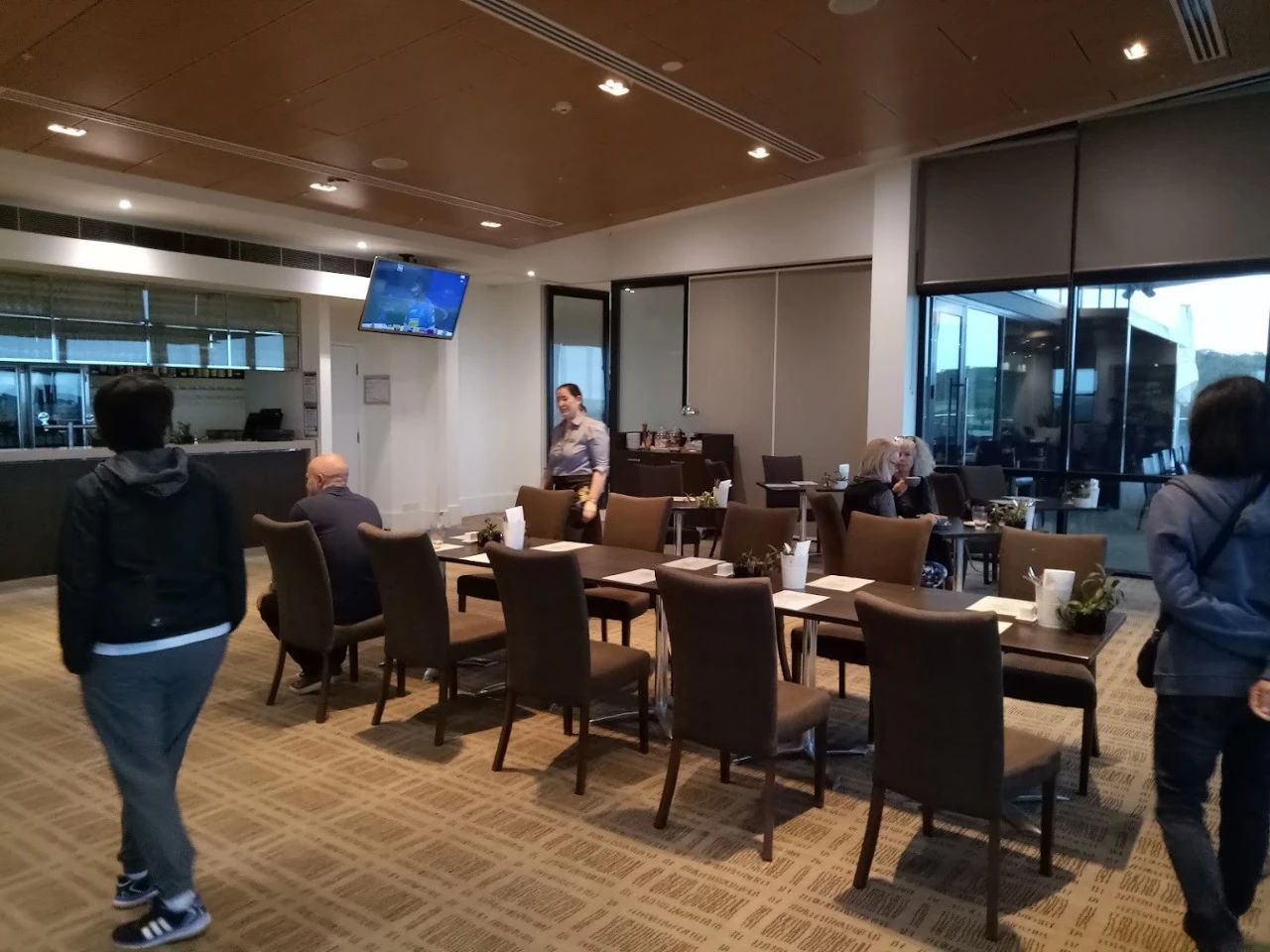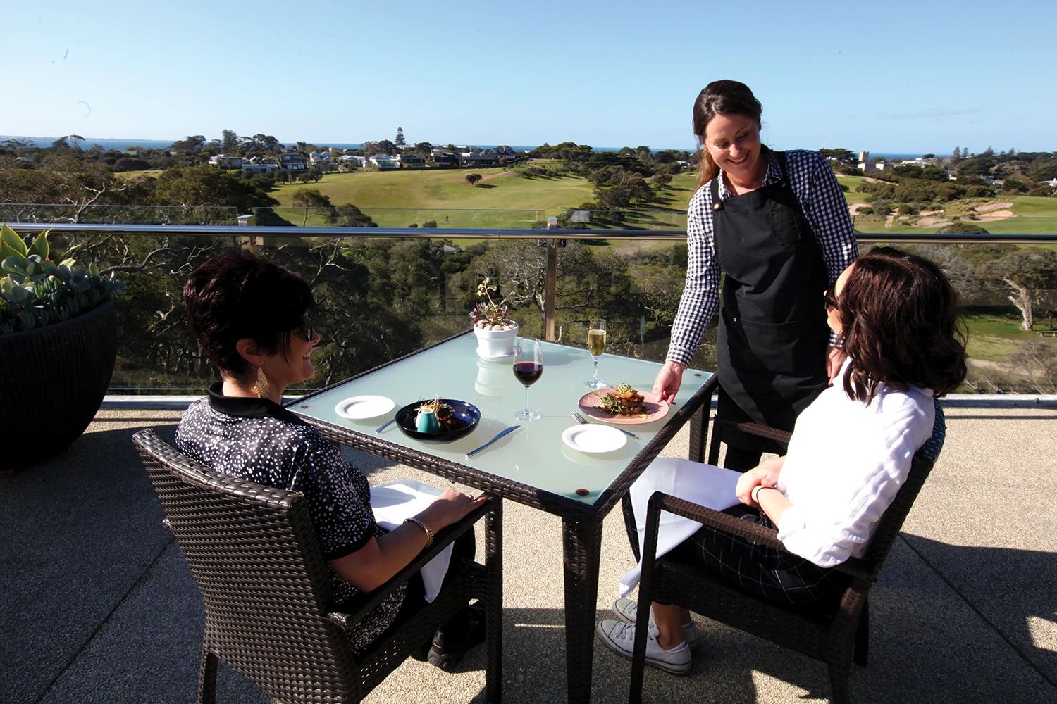 您可以享受我们友好的工作人员的热情款待,同时从宽敞的甲板上欣赏球场和海湾的景色。