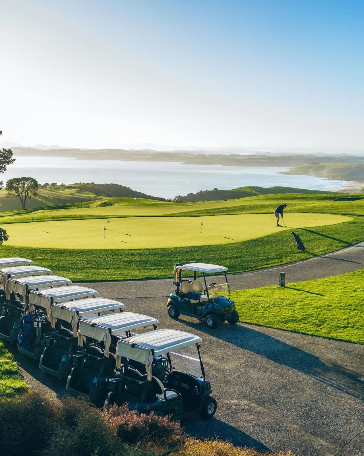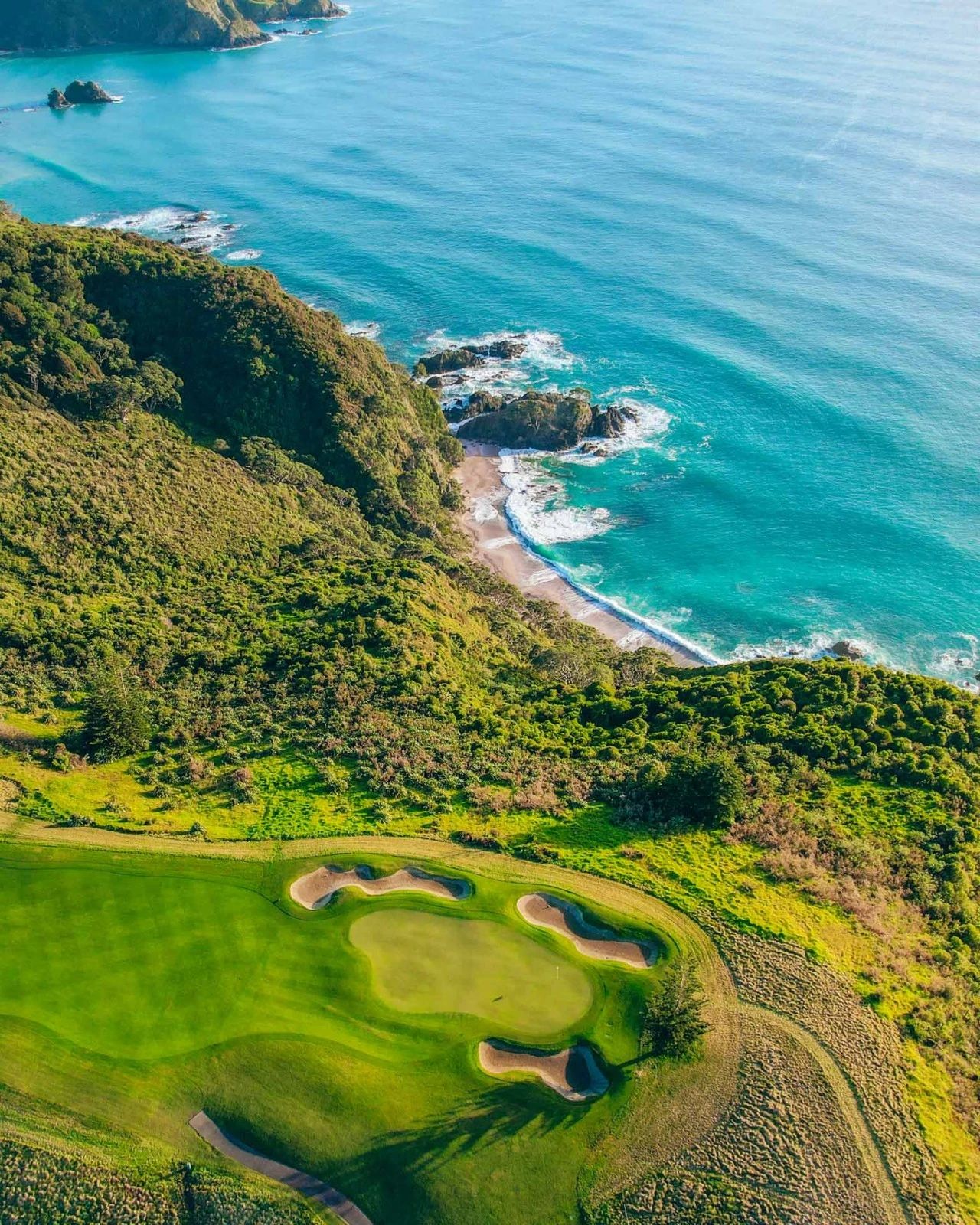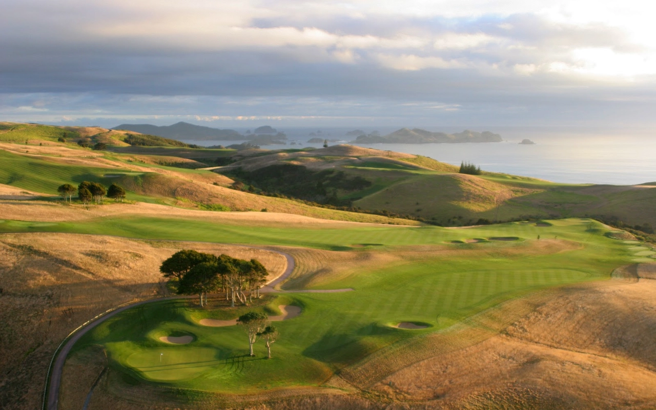 贝壳杉悬崖 (Kauri Cliffs) 坐落在高耸的悬崖和连绵起伏的农田之间,拥有由 David Harman 设计的壮观的 72 杆锦标赛高尔夫球场,毗邻豪华海滨度假村 Rosewood Kauri Cliffs。