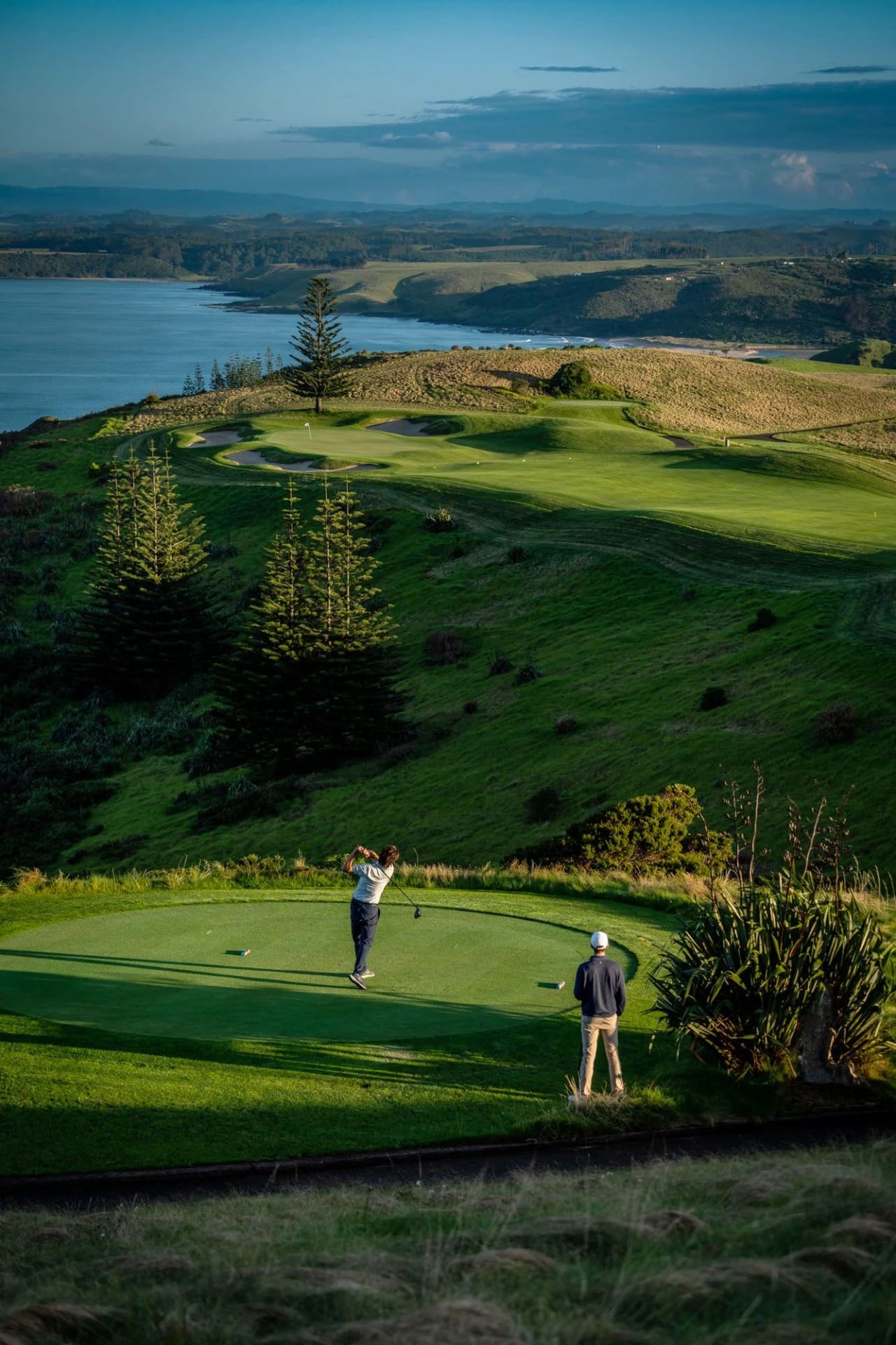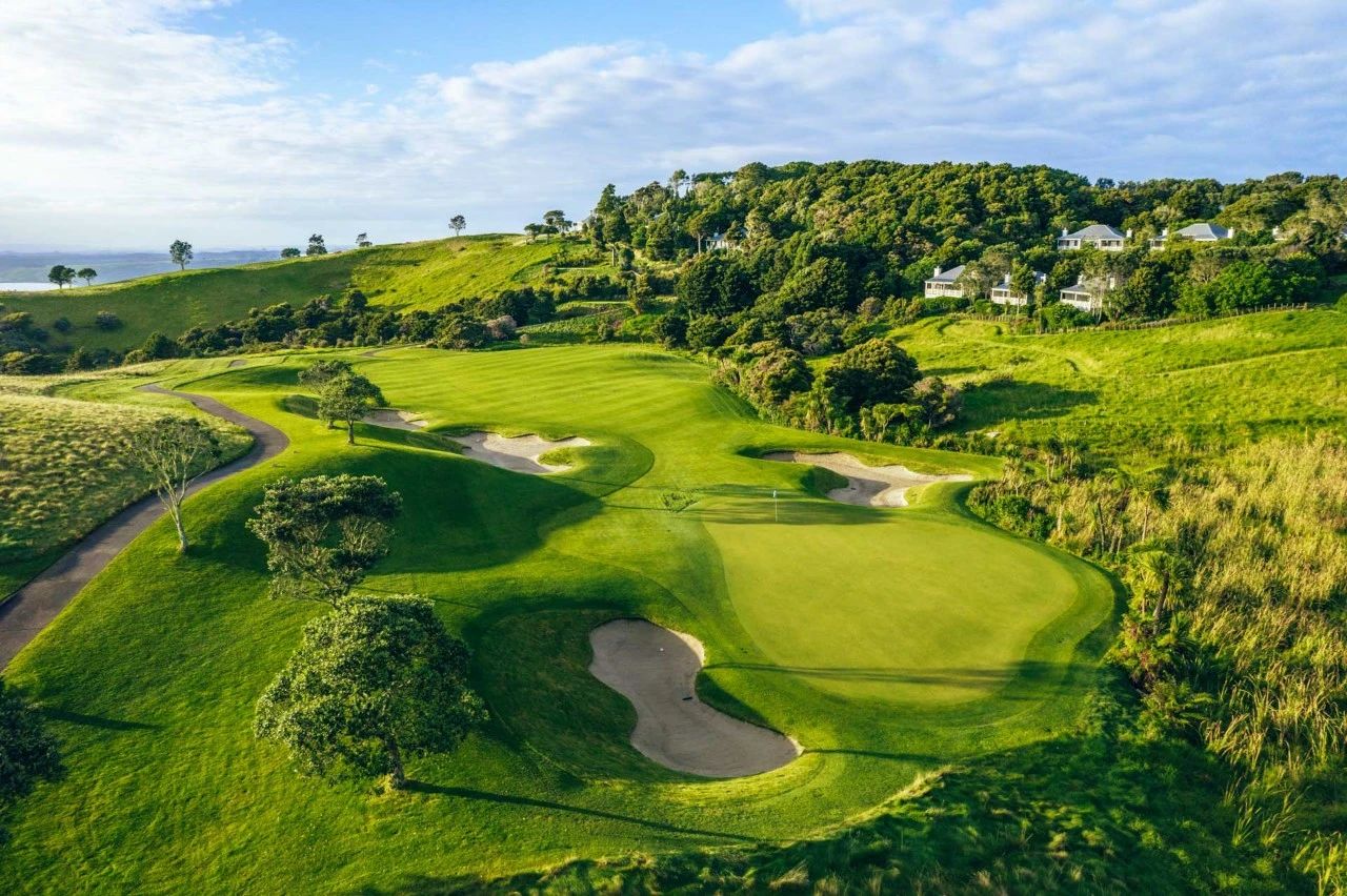 “从一开始我们就知道拥有一块特殊的财产。自然美景始终令人惊叹,因此我们真正的目标是打造一个非常特别的高尔夫球场,让世界各地的人们都称赞和享受。与此同时,我们希望将贝壳杉悬崖维持为一个正在运营的农场,事实也确实如此;它占地 4,000 英亩,而球场实际上只是其中的一小部分。”十五个洞可欣赏太平洋美景,其中六个洞是沿着直入大海的悬崖打球。美丽的内陆洞蜿蜒穿过沼泽、森林和农田。目前,贝壳杉悬崖 (Kauri Cliffs) 在《高尔夫文摘》全球 100 家最伟大高尔夫球场中排名第 37 位。 虽然早期在深谷内有一些不错的策略性高尔夫球场,但最令人难忘的是向内的九号洞,从一杆长的第 14 号洞开始,面向大海的环洞,它直视着卡瓦利群岛。接下来的三个沿着海岸的洞是最引人注目的,因为高尔夫球最接近悬崖边缘,而且景色完全不受干扰。尽管打球令人兴奋,但第 15 号洞可达到的五杆洞的马蹄形终点有点严酷,可能会让安全打球对于那些想要抓到小鸟的人来说太有吸引力。有时可开球的第 16 号球洞向远方的大海进发,遗憾的是,它也偏向于保守的打法,但第 17号球洞非常棒,拥有倾斜的架子球道和沙坑良好的果岭,背景是令人难以置信的岛屿湾。由于每天都会有四个角风,这里的设置和条件比其他地方更难,但由于有多种开球选项,该球场仍然适合普通高尔夫球手。尽管贝壳杉悬崖具有非常明显的吸引力,但最终使贝壳杉悬崖未能跻身顶级行列的原因是缺乏与其令人惊叹的环境相匹配的真正的世界级设计。然而,贝壳杉悬崖几乎没有一片草叶错位,而且风景优美,是一场视觉盛宴,一定会给大多数在这里打高尔夫球的人留下深刻的印象。高尔夫综合设施包括世界一流的练习场、推杆果岭和切杆果岭、库存充足的高尔夫商店以及女士和男士更衣室。提供高级女士和男士租赁俱乐部。 是新西兰当地制造的羊绒和羊毛产品以及当地艺术品和雕塑的重要来源。提供专为高尔夫球手设计的美味菜单,在贝壳杉悬崖 (Kauri Cliffs) 的烹饪团队轮流享用赛前或赛后小吃或午餐。环境俯瞰着大海,第 19 洞或草坪上设有小酒馆座位。还可以为您安排外带午餐,让您随身携带,并在开球前预订。