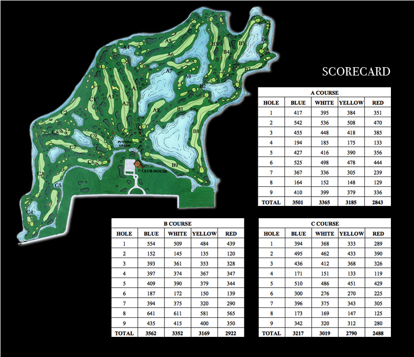 分为三个不同的九洞球场。球场 A 有许多大小不一的树木,球道保持得非常好,水障碍也是一大特色。其中最精彩的球洞要数七号洞(标准杆 4 杆洞),该洞长 336 码,需要在湖面上打 180 码,然后盲打上果岭。虽然旗帜清晰可见,但果岭却在视线之外,这使得这一洞格外具有挑战性。