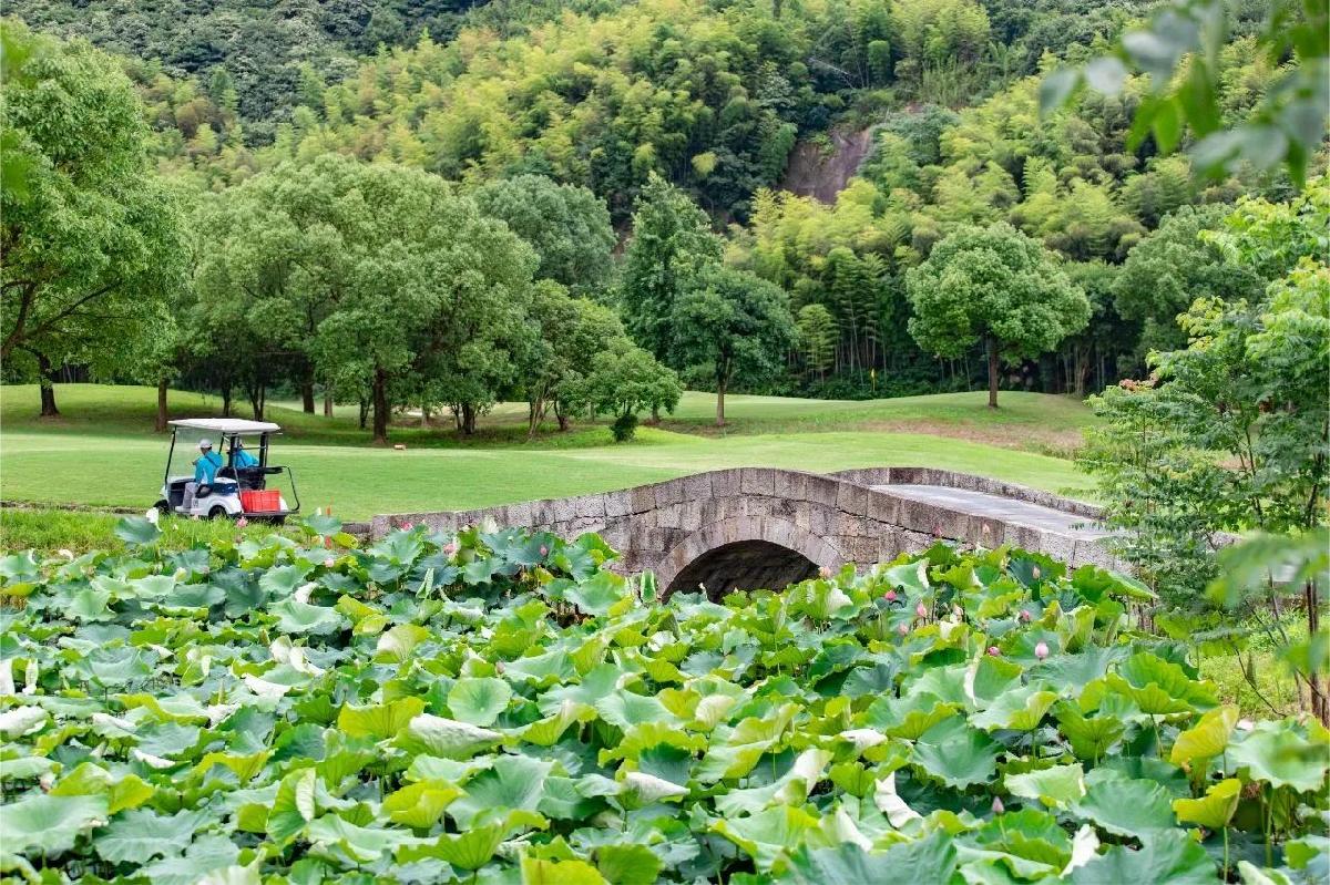 宝业会稽山国际高尔夫球场是一个18洞72杆国际标准的具有山地特色、水乡风貌的旅游观光型高尔夫球场,分为南北各九洞。会所紧邻洄涌湖而建,从会所向西有主路与阳明路相连。