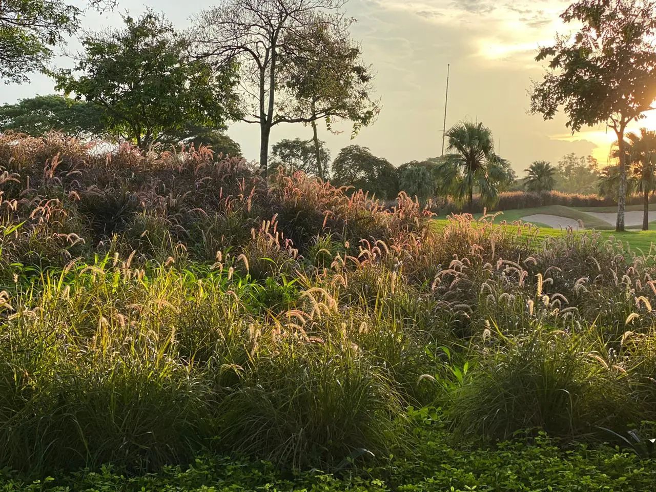 这是一个绿色天堂的概念,广阔的草地在 27 洞的每个区域都装饰着海岛至尊雀稗草,加上美丽的紫色地毯的异国植物和平静美丽的湖水。
