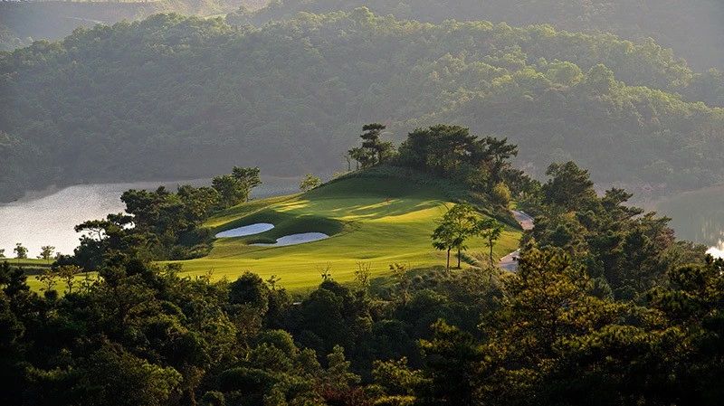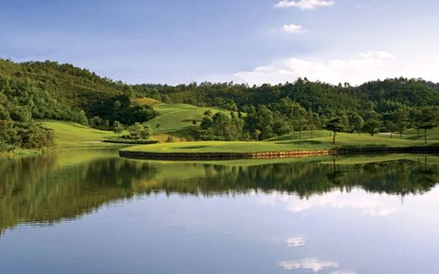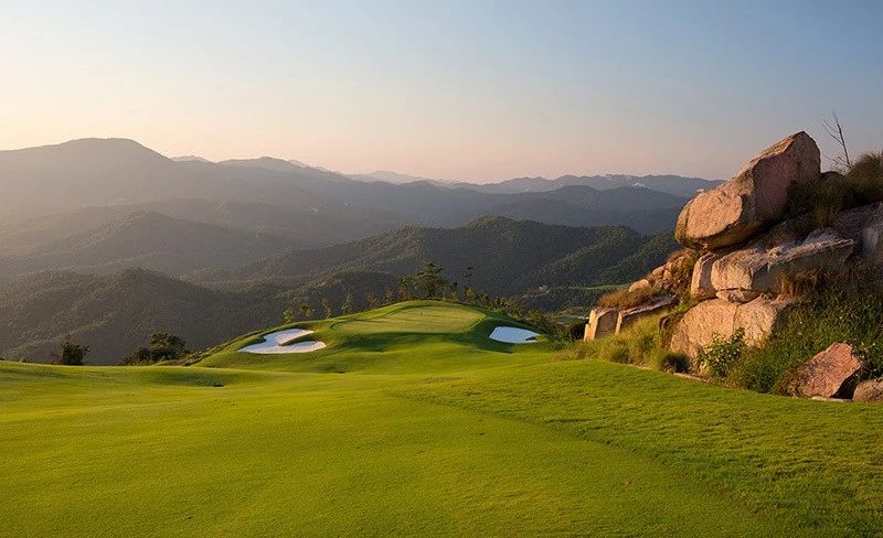 在峰峦叠嶂的环抱中,整个球场亦林木葱郁,绿草如茵,各球道或绕碧湖妖娆,或凭青山蜿蜒,如诗如画。