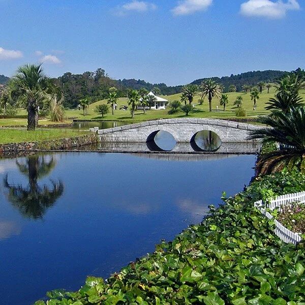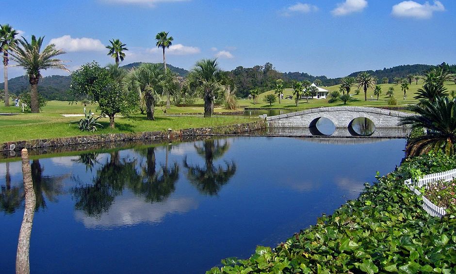 三重县凤凰高尔夫球会,是cocopa俱乐部很有特点的一个球场,草坪及球道之间种着茂密的海枣树和椰子树,感觉置身于夏威夷的度假村球场。据球会的总经理介绍,这里似乎专为女性打造,充分考虑女性的喜好。球场红梯5294码,比普通的红梯距离都短,加上球道开阔,让普通的女性选手都可以体会高尔夫的乐趣。会所里还摆放许多女性刊物,以及大量的服装销售。但凤凰球场同样受男性球友的青睐,蓝梯6846码,如果遇上刮风,球场的难度会大大增加。但在球车上装有大幅的球道图供球友浏览,球道图用塑料封着,18张球道图都是活页,固定在球车的右侧,对于对场地不熟的选手非常有帮助。凤凰球场还有一个特别的设计,球场所用的码数本很别致,上边除了球道攻略之外,还用表格让你清楚地记录每一杆的情况。比如第一杆是用铁杆或者木杆开球,开球之后是偏左偏右下水或者OB,这些都让你用铅笔打勾即可完成,随后是这一杆的击球距离,风向是无、顺风、逆风还是侧风,球道上上坡还是下坡。每一洞都留下六杆让你记录,之后是劈杆和推杆数,每一杆都能让你简单方便地详细记录。