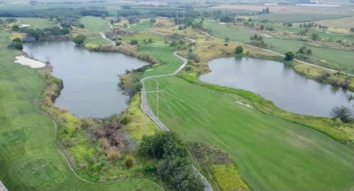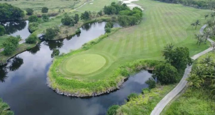 球场是由美国高尔夫协会副主席ROBBINS先生亲自操刀设计,外籍造型师KENNY先生倾力打造的锦标级18洞72杆球场。球道全长7289码,以林克斯风格为主,球场充分利用当地原始自然景观,展现一片旖旎的田园牧歌风光,极富娱乐性与挑战性。球会会所面积4271平方米,共分2层,外立面采用了独特的草原有机建筑设计风格,融合周边田园风光。为保持和尊重林克斯风格的涵义,整个球场严格保留了原有的自然地形地貌和植被。绵延起伏的地形、宽阔的湖面将高尔夫各种不同的球技战术的运用巧妙地揉和在这片场地上,使不同程度球技的选手,在难度各异的球道上一试身手, 磨练球艺。