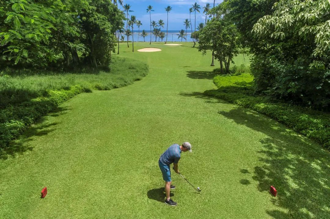 这个9洞的球场,从山坡到海边的美景尽收眼底,巨大的树木和灌木相映成趣。