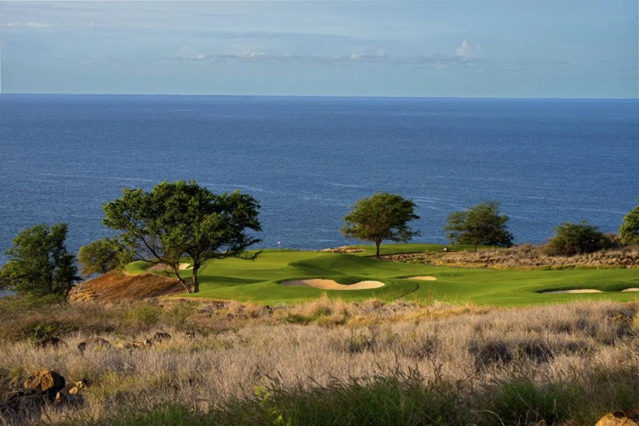 前九洞的亮点是从第 5 号球道可欣赏到马内莱湾 (Manele Bay) 的景色,该球道高于马内莱高尔夫球场的第 6 号和第 7 号球道,直接通向远处的海湾。