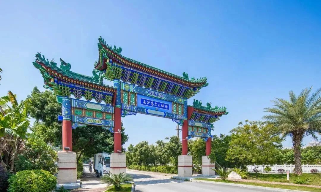 在前往南沙高尔夫球场必经之路上,有一块1995年建造的混凝土结构加木装饰构件的仿清式歇山顶牌坊:南沙高尔夫球场牌坊。它是广州市历史建筑南沙牌坊同时期、同设计团队、同施工团队建造的姐妹牌坊。可以说,这是一个具有历史感氛围的高尔夫球场。