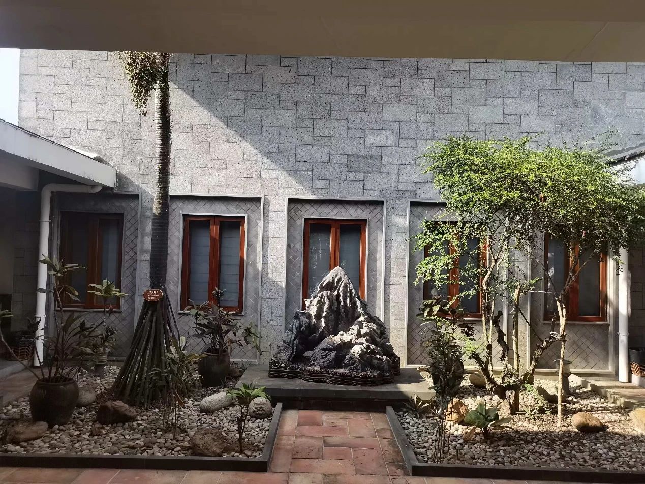 隐匿于翠绿环抱之中,仿佛是大自然精心雕琢的艺术品。步入其间,首先映入眼帘的是几块形态各异的灵璧石,它们静静地伫立在庭院一角,以其独特的纹理和色泽诉说着岁月的故事。