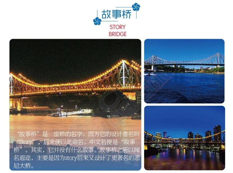 故事桥连接南岸与布里斯班,也是游客“到此一游”必去的景点之一。该桥建造于1940年6月6日,桥身的96%建筑材料都是取自澳洲当地。