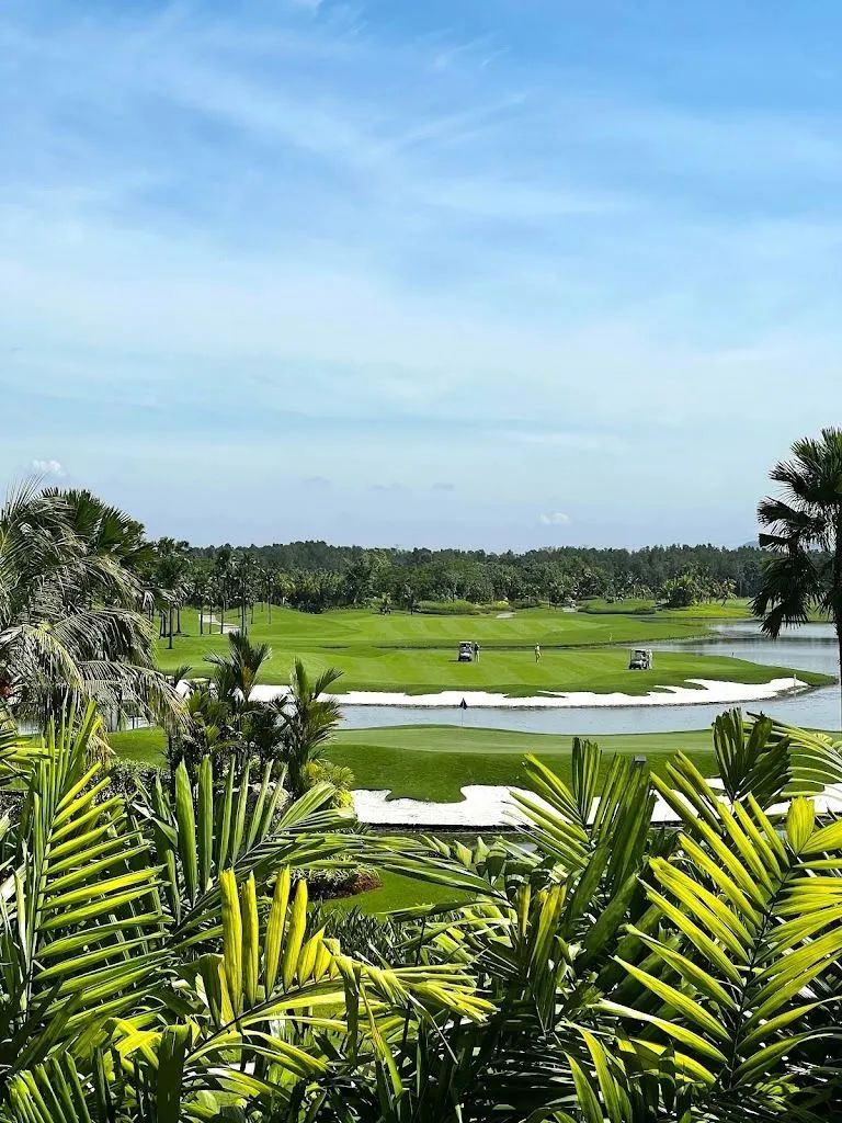 新加坡吉宝乡村高尔夫球会,成立于 1904 年,这座拥有百余年历史、从最初在一个肉豆蔻种植园只有3个洞的球场,一直到21世纪发展成为一个长约 6,000米,拥有18个打道 72 杆大型球场的标准高尔夫球场。,以其起伏的地形和茂密的自然植被著称。它绝非仅是风光明媚,而是为球手精心设计了一系列充满策略与惩罚性的严峻考验。 球场的挑战首先来源于变化多端的球洞设计。例如,多个球洞呈现经典的“狗腿”状。其中,1号洞的开球必须精确避开左侧山岩与右侧沙坑。紧接着的 2 号洞更是将这种策略性发挥到极致,若想获得标准杆,开球必须精准地打向右侧以获取进攻果岭的最佳角度。最具标志性的莫过于第18洞收官洞,它被誉为全球五百个最佳球洞之一。其第二杆抉择尤为艰难:必须使用长铁杆或球道木杆飞越果岭前10 码的深沟,而果岭右侧的沙坑与后方的沙丘正虎视眈眈。 除了球道布局,水域与沙坑构成的障碍体系无处不在,且惩罚性极强。第3 洞是一个标准杆3杆洞,开球区下方 60 尺的巨大池塘时刻威胁着左侧区域;第 8 洞的半岛型果岭则完全被池塘与沙坑所包围。此外,第 4 洞的球道上竟分布着八个沙坑,而多数果岭周围也都被沙坑严密守卫。这些障碍与新加坡常见的海风相结合,共同构成了对球手击球精准度与策略判断的终极试炼。无论是新手还是老手,这座球场都将提供一段令人难忘的挑战之旅。